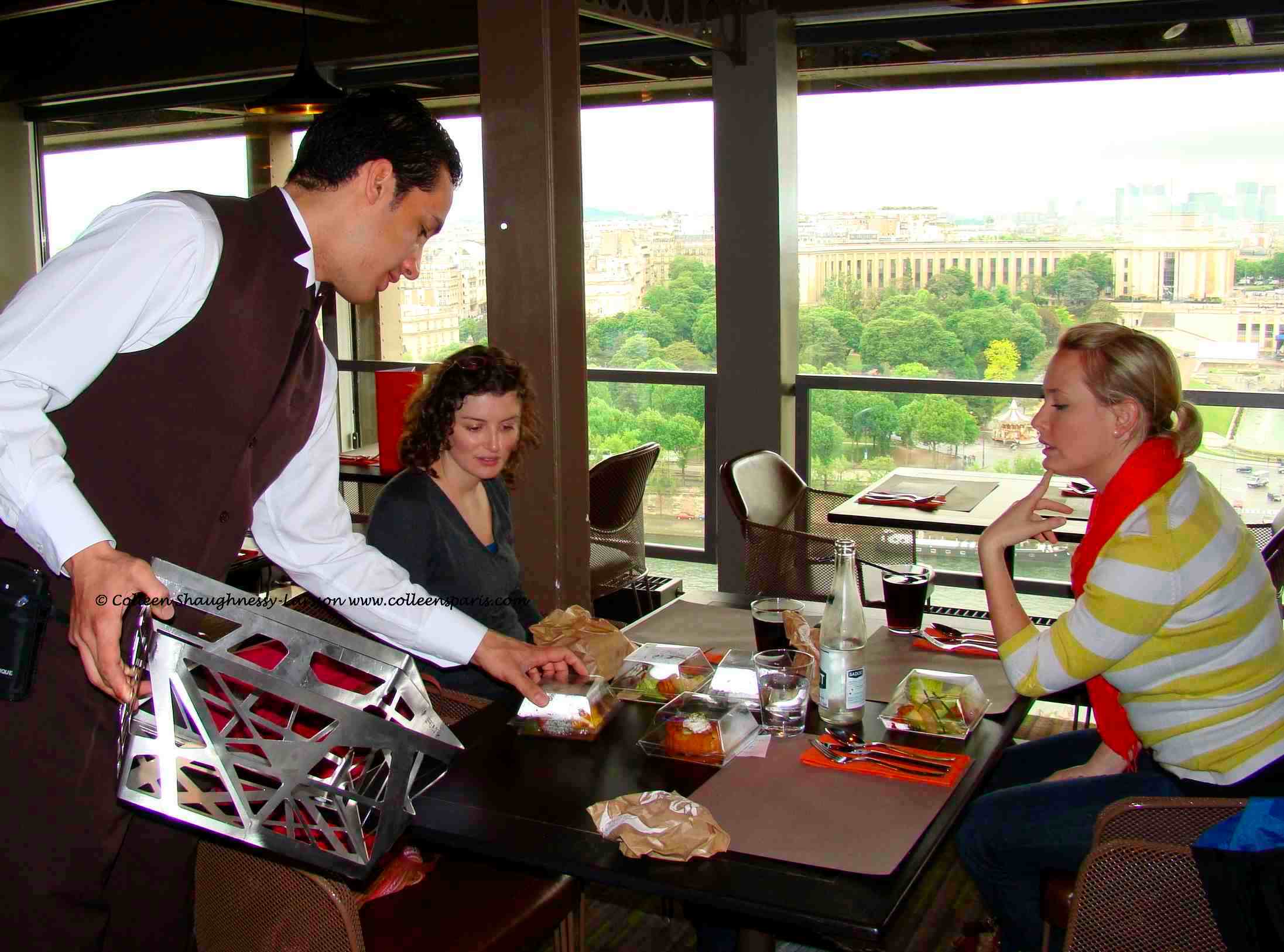 When you are welcomed into the 58 Tour Eiffel and shown to your table, your brightly colored menu explains the procedure. In sum, you follow the instructions. Your picnic basket contains your cold items; your server delivers your drink and hot main course and your bill once you ask for it. For details visit their site, click on “Discover” , and find answers to their “Service”, “Cuisine”, and “Practical information”, plus videos of the experience.