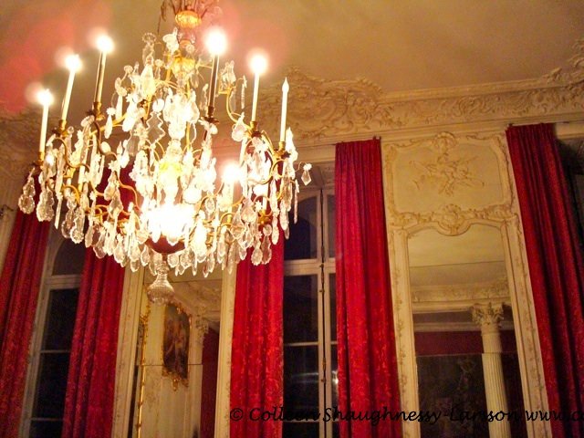 In the Chambre du Prince, you are surrounded by walls framed in relief sculptures in rooms lit by chandeliers reflected in ornate gold-framed mirrors above the marble chimneys. The décor and twisted gold candelabras on the wall seem to speak a story all their own.
