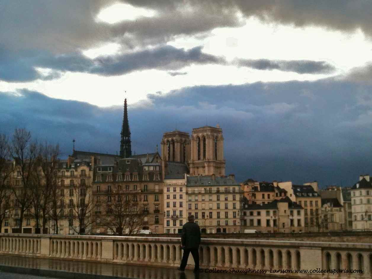 Pont Louis Philippe looking back at Ile de la Cité at around 5:30 p.m. as the sun shines through the clouds