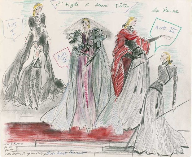 Yves Saint Laurent, Croquis des costumes de la Reine incarnée par Geneviève Page, L’Aigle à deux têtes, 1978