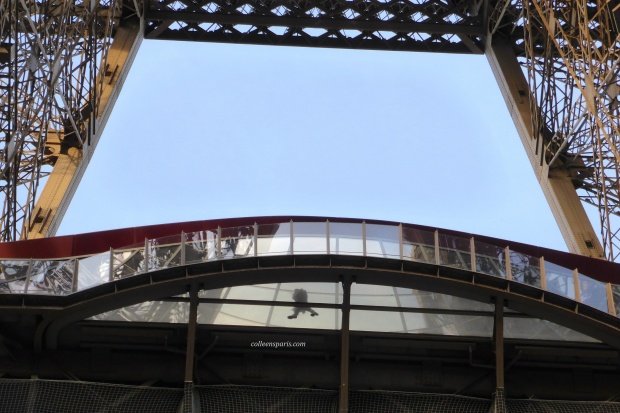 Looking up 57 meters through the transparent glass floor of the Eiffel Tower