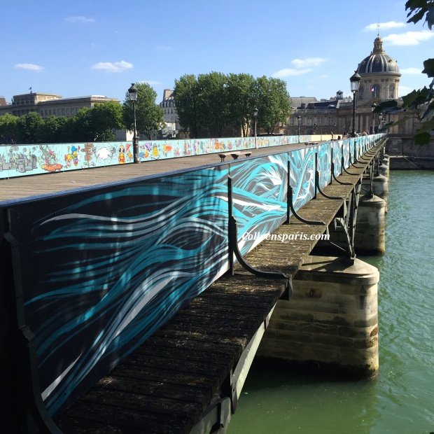 Official Graffiti on Pont des Arts (bridge Napolean I built) until October 2015 with the works of international street artists Jace, El Seed, Brusk and Pantonio. Read more about the 45 tonness of locks (99,208 pounds/45,000 kilos) on Street Art Replaces Padlocks and on Colleen’s Paris Padlocks of Love Weigh Down. #lovewithoutlocks