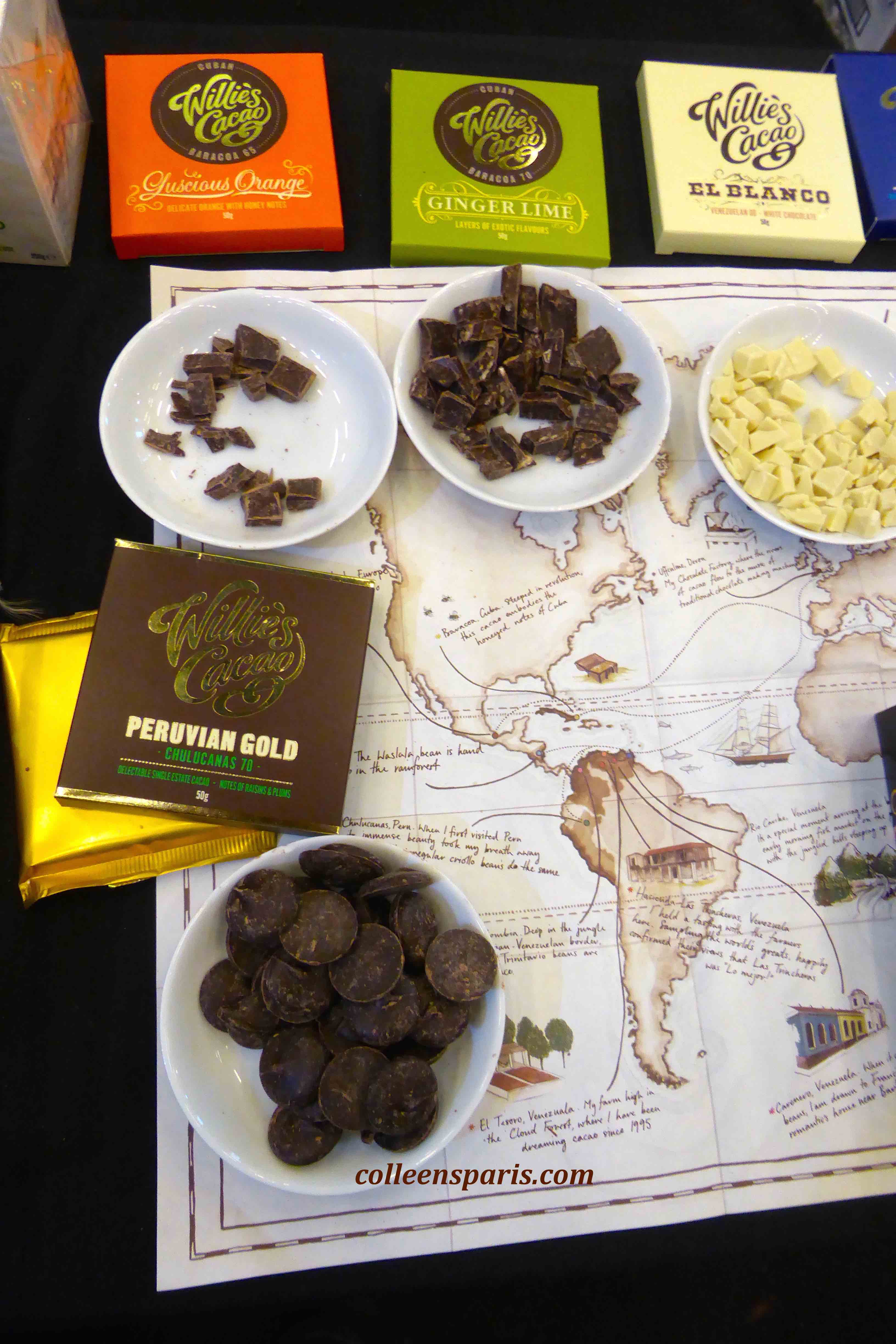 On opening day, I entered the Salon du Chocolat while the afternoon sun was shining. The colorful packaging struck my eyes brightly! Entering the trade show on the second level, I was swept up globally and landed in Brazil. After doing a tasting I bought three squares of various Brazilian chocolates from Mendoá: café, ginger and 80% with cocoa feves with in my first ten minutes on site. I had to watch that my cravings did not get near my purse… My taste buds were set to seek out the unusual in this year’s Salon du Chocolat. By the time I left this vast array of packaging three hours later, the sun had set. I was not craving chocolate any longer, but the pavilion did look like one big box of chocolate.