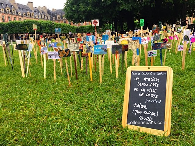 Art galleries surround Place des Vosges. I enjoyed an art gallery set up on the park grounds the other day. On my way to Monoprix Saint Paul, the colorful stakes with art in their wood rectangles contrasted with the grey sky. Playing on the art form “still life”, the theme written on the small blackboard said: “nature (pas encore) morte” – nature (not yet) dead.
