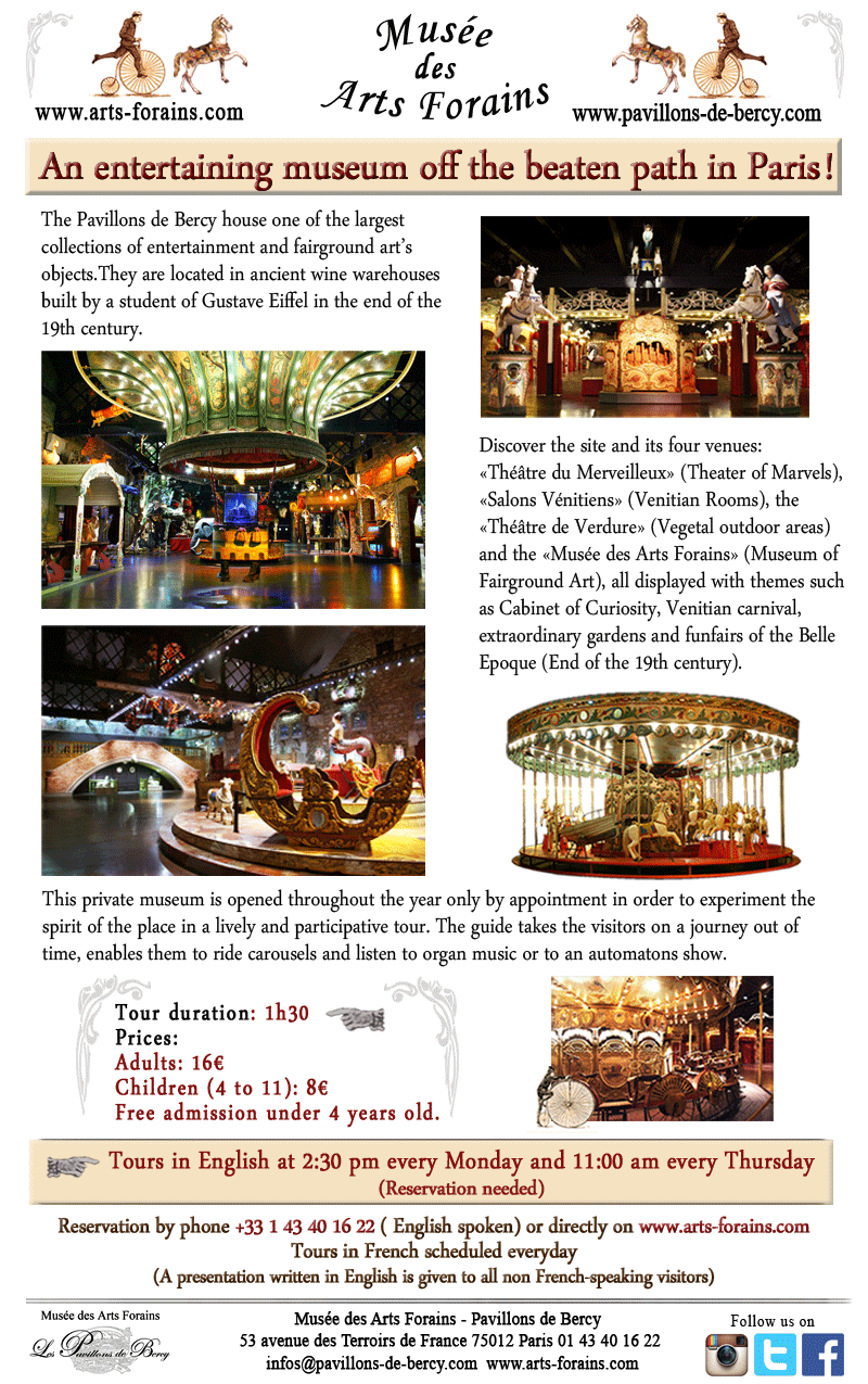 As the poster says, this is “an entertaining museum off the beaten path in Paris!” The Musée des Arts Forains (Museum of Fairground Art and carnival rides) is a large collection of entertainment and fairground art objects. English tours are planned for Monday and Thursday: July 11, 14, 18, 21, 25 and 28; August 1, 4, 8, 11, 15, 18, 22 and 25 (reservations required). Tours at other times are in French.