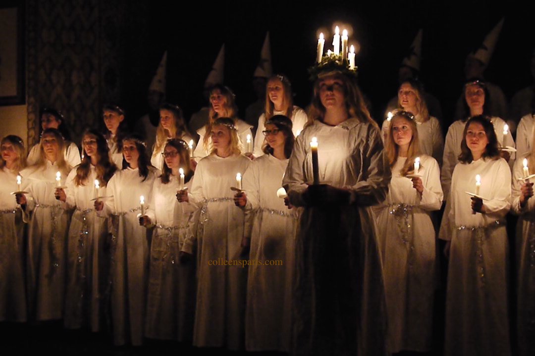 Sankta Lucia (Sainte Lucie, Saint Lucia, Santa Lucia, etc.) is a choral presentation and procession filled with candlelight. In the procession, the church choir holds candles and sings; the Lucia wears a crown of candles her head. It is a tradition that I experienced when I lived in Stockholm and one that continues here in Paris.
