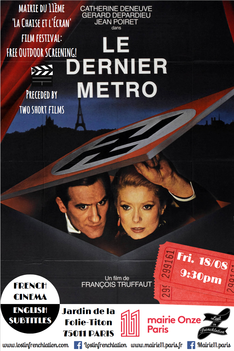 “Lost in Frenchlation is thrilled to be working together with La Mairie du 11ème for the second year in a row to bring you free outdoor screenings of French films with English subtitles as a part of the highly anticipated 10th annual ‘La Chaise et l’Écran’ cinema festival! Join us for two short films followed by the classic feature length film « Le Dernier Métro » (1980) by François Truffaut (which won 10 César awards!) on August 18th.