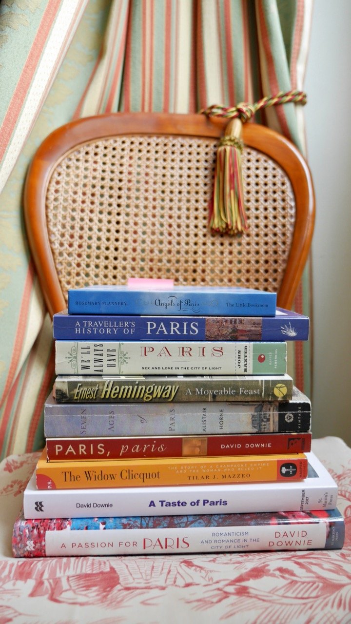 Chair with stack of books about Paris and Champagne, Hemingway, Angels
