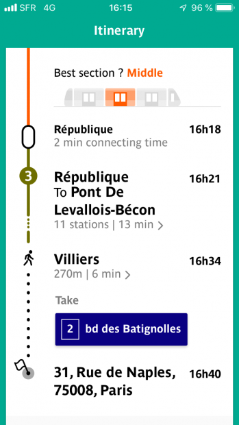 The good news is that as in life, not everything is perfect. Using the RATP app today, I noticed a flaw; the train cars were reversed. Taking line 5 to Stalingrad (line 2), I know from experience that you enter the last car on line 5 to change easily to the Stalingrad line. At Stalingrad you get in the first car to easily exit at Place de Clichy. The app showed just the opposite. No worries, everything else was accurate and they are making an improved effort to make travel easier. Enjoy!