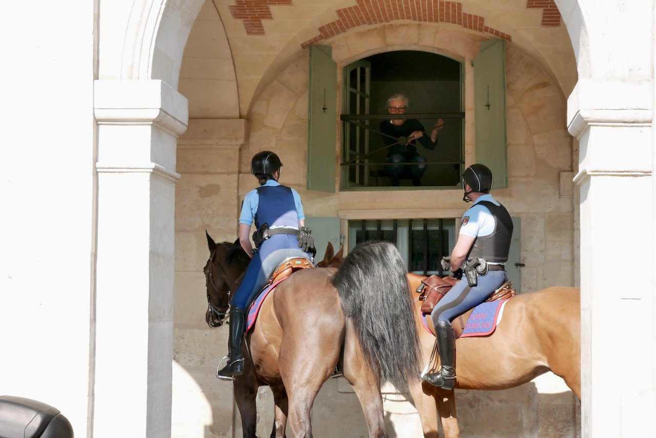 I heard the sound of the horse shoes on the pavement. The gendarmes I passed earlier had made it to the red-bricked, east-facing pavilions along the park. The horses with their military police astride continued under the vaulted arcades to an open window with green shutters. Both gendarmes were chatting with the resident above a shop as I approached.