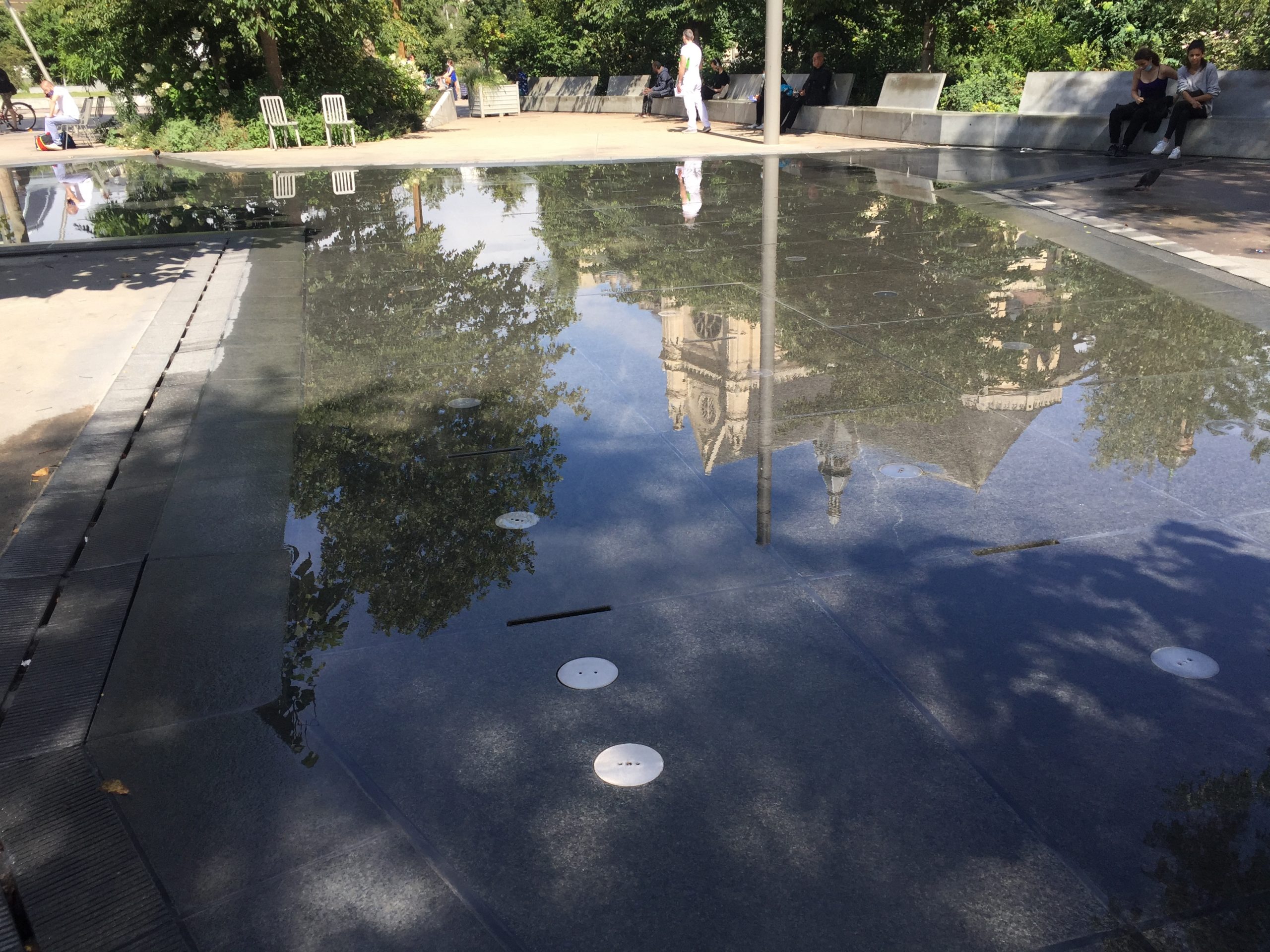 After walking for the last 20 minutes between the shade of the buildings and the sun, our body temperatures mounted. On this warm, July morning we were sitting in the shade chatting before going into Les Halles. Without warning we received a lovely surprise: a light mist spouted forth from the fountain in the Jardin Nelson Mandela. It lowered our body temperatures and the air around us. We were ready to attack the book section at FNAC!