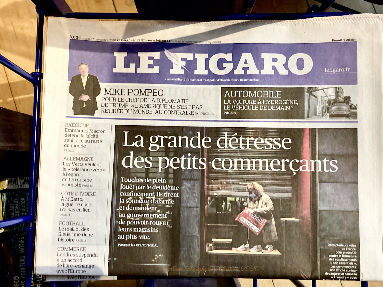 Le Figaro newspaper the distress of the small business owners. The For Sale sign shows the phone number of the Elysée Palace, official Presidential residence