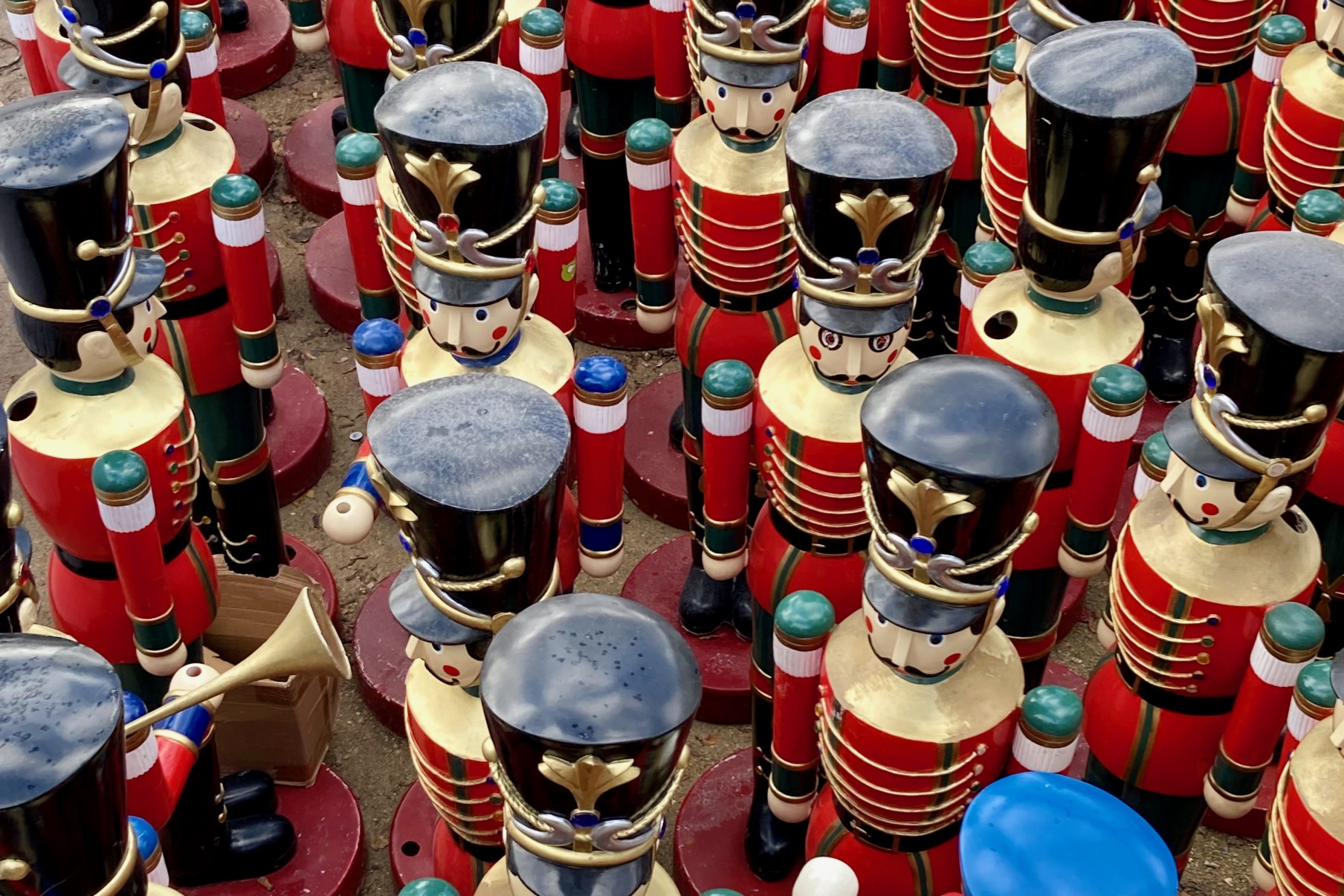 What greets you when you enter the Annual Christmas Market at the Tuileries Gardens? Nutcracker Soldiers. And before the market opens? Where are they? Hidden, waiting to get out in the open. I noticed them while crossing the gardens on November 18. My eyes fell upon rows of black hats. The trove of Nutcracker Soldiers holding horns or standing at attention were lined up. Their expressive eyes were waiting for a magic moment.